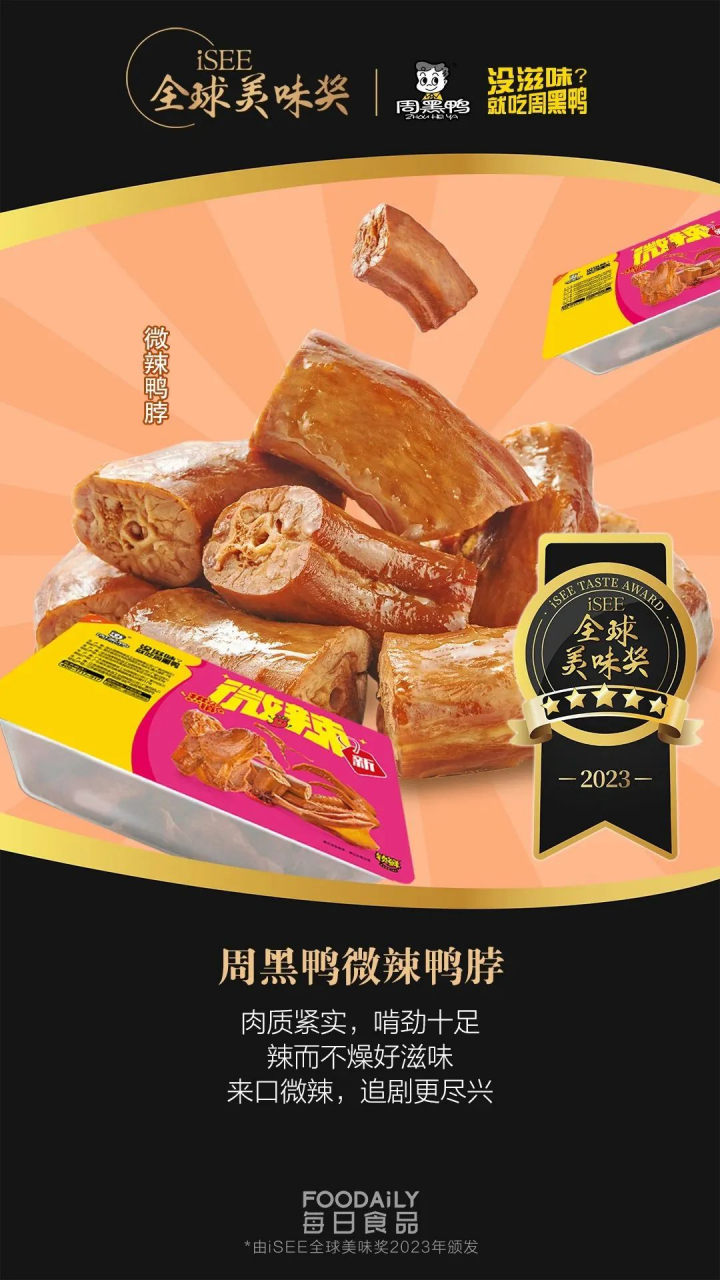 第五屆iSEE全球食品創(chuàng)新獎(jiǎng)?lì)C獎(jiǎng)典禮,周黑鴨憑借自身品牌和產(chǎn)品實(shí)力,從321個(gè)品牌、842款產(chǎn)品中脫穎而出,強(qiáng)勢入圍,并一舉斬獲7項(xiàng)大獎(jiǎng)。旗下產(chǎn)品【微辣鴨脖】榮獲「iSEE☆☆☆☆☆全球美味獎(jiǎng)」!